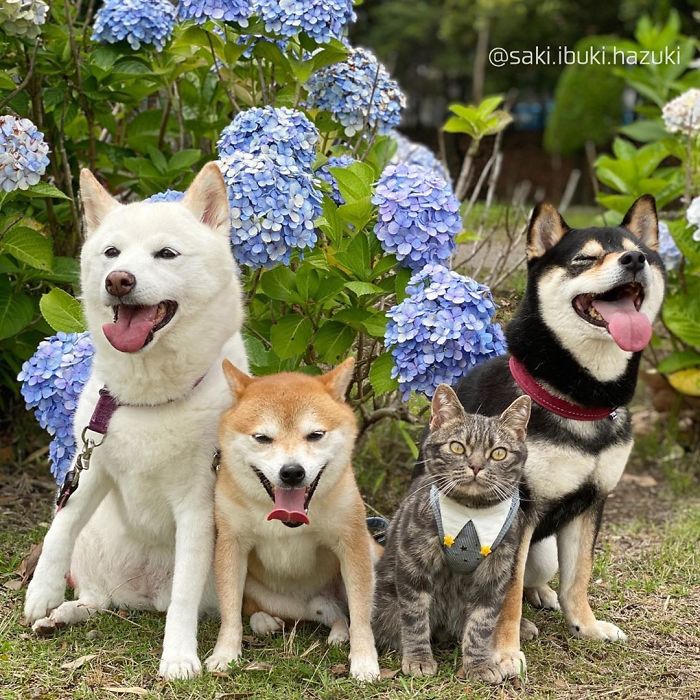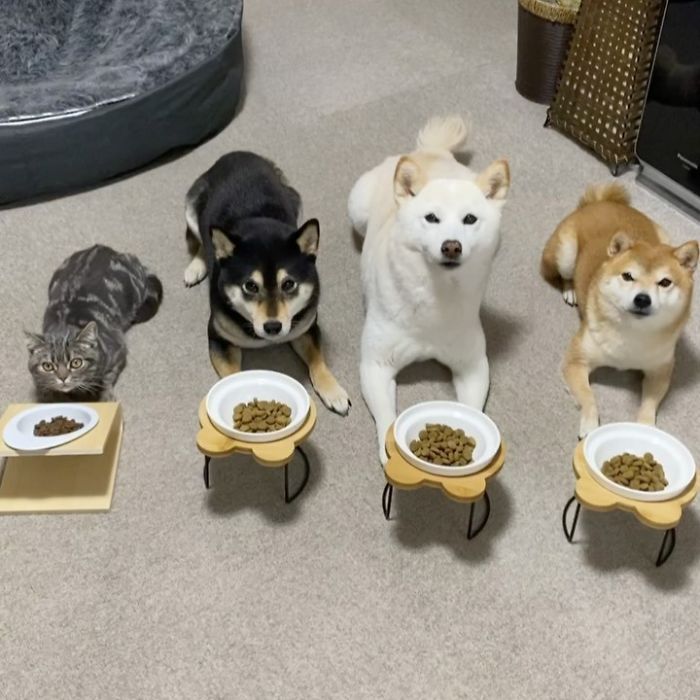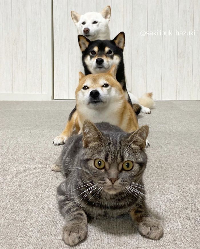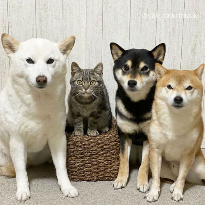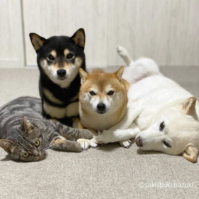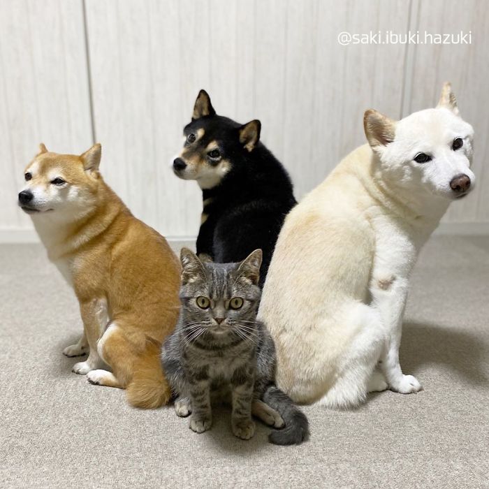 Voici donc un chat et trois chiens de race Shiba.